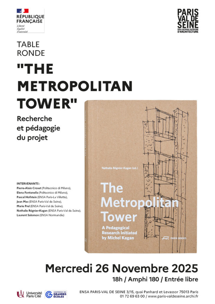 À l’occasion de la publication du livre « The Metropolitan Tower, une recherche pédagogique initiée par Michel Kagan » aux éditions Park Books sous la direction de Nathalie Régnier-Kagan, une Table ronde est organisée avec certains des auteurs, afin de débattre de la question de la grande hauteur dans l’enseignement du projet : il est devenu évident que les tours sont de plus en plus présentes dans les métropoles européennes. Le travail pédagogique engagé par Michel Kagan il y a 25 ans a suscité des prolongements sous diverses formes, toutes considérant la verticale comme une direction prospective du déploiement de l’espace public. Plutôt que l’expressionisme individuel, il s’agit d’établir une « architecture de relation », prenant en compte le contexte, considérant l’espace et le « lieu » comme matériaux d’urbanisme. C’est cette hypothèse qui sera en débat.