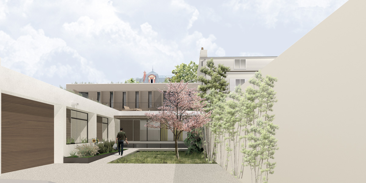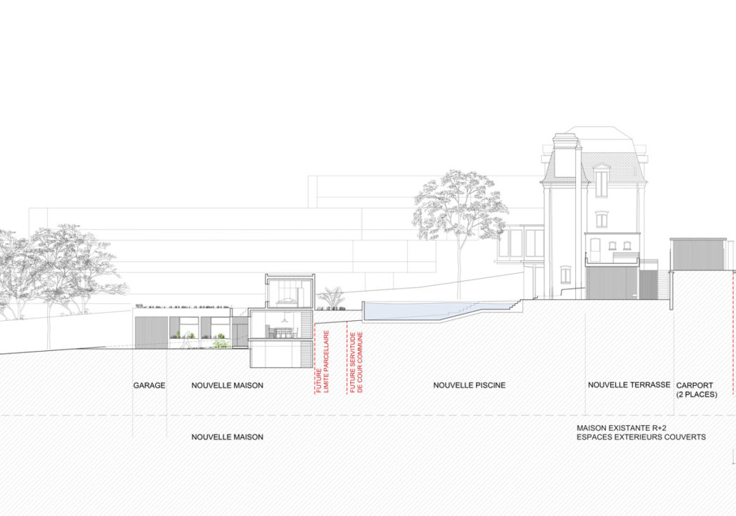 Il prévoit un nouveau stationnement avec carport, abri vélo et local poubelles sur la rue Yves du Manoir. Le déplacement de l’escalier améliore la relation entre niveaux et permet la création d’un espace couvert en rez-de-jardin. À l’est, un bassin de nage et un remodelage paysager renforcent l’usage du jardin tout en limitant l’impact visuel.